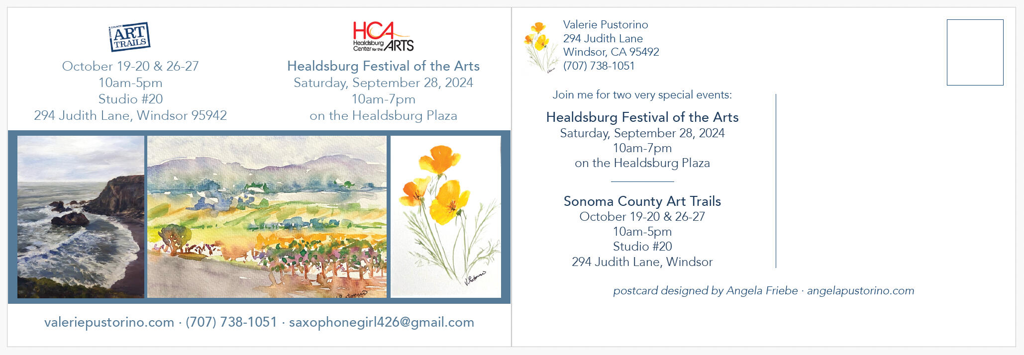 Artist Valerie Pustorino needed a postcard promoting two upcoming events. I created a 4"x6" postcard for her, provided a series of revisions with her guidance, and then ordered the postcards for her through a print service I trust.